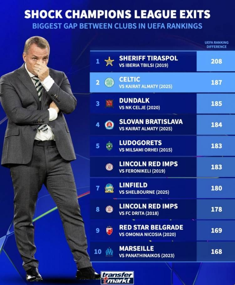直播吧8月28日讯 欧冠附加赛次回合,凯尔特人在点球大战中不敌阿拉木图凯拉特,目送对手队史首次闯进欧冠正赛。根据德国转会市场的统计,凯尔特人本次被淘汰是欧冠历史交锋两队欧足联积分差距第二大。